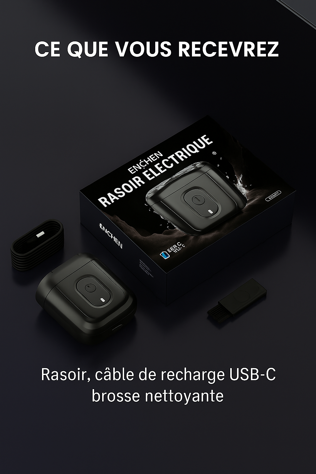 Votre rasoir est livré avec son câble de recharge USB-C et une brosse de nettoyage pratique.