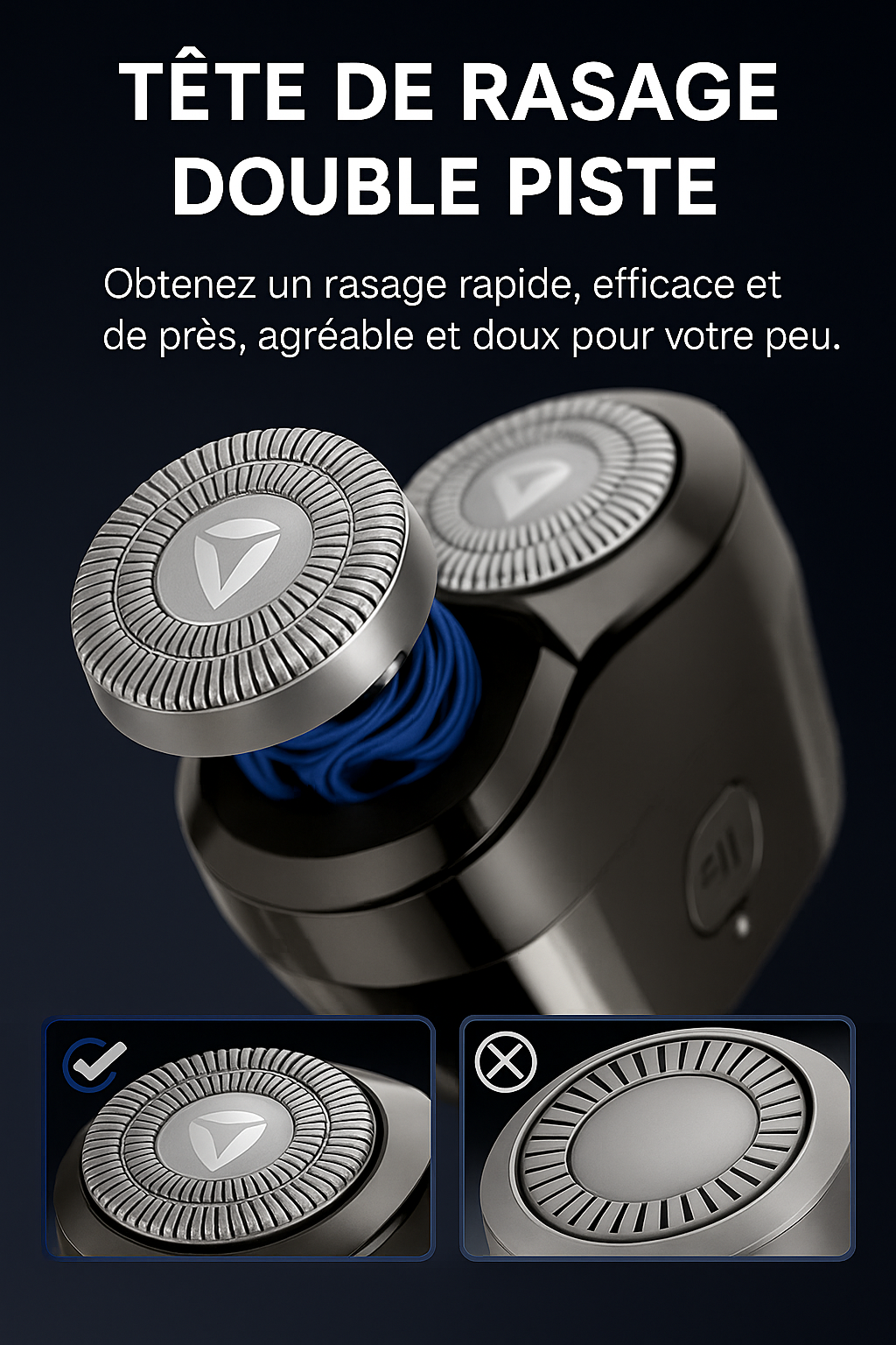Sa double lame rotative assure un rasage net et homogène, sans effort.